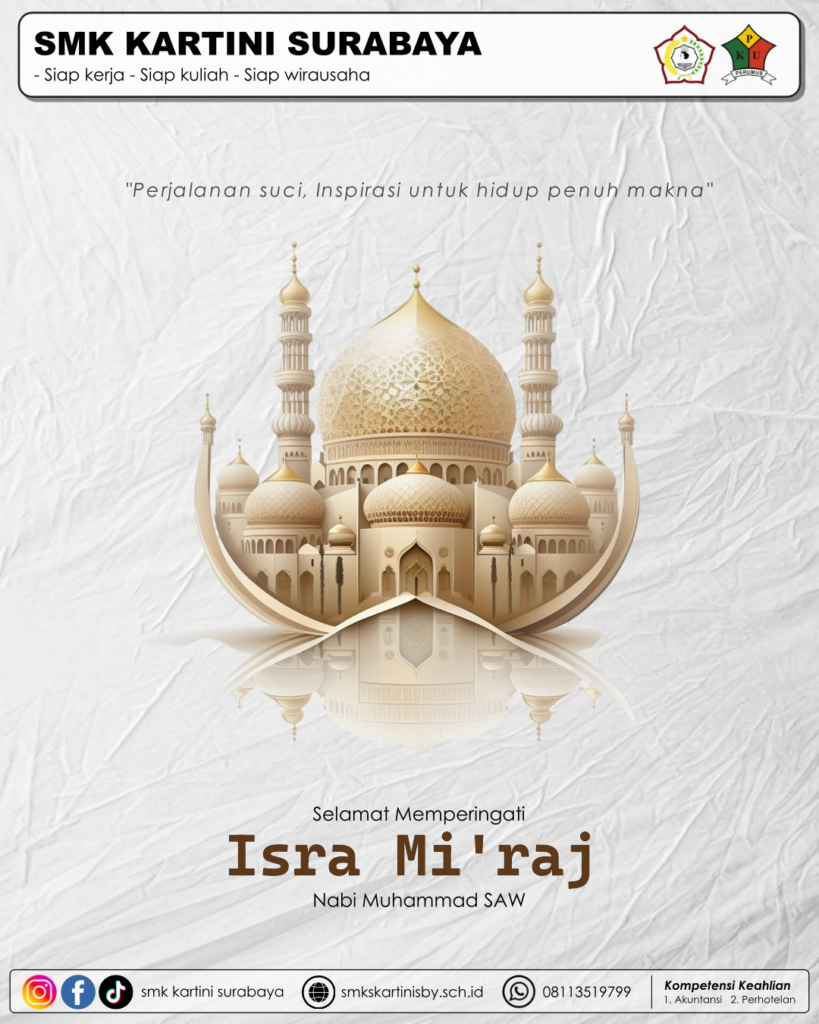 Dalam rangka memperingati peristiwa agung Isra Mi’raj Nabi Muhammad SAW, SMK Kartini Surabaya mengajak seluruh civitas akademika untuk menjadikan momen ini sebagai sarana meningkatkan keimanan, ketakwaan, serta akhlak mulia dalam kehidupan sehari-hari.