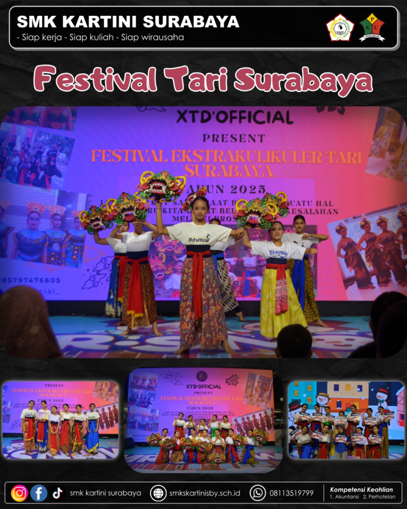 SMK Kartini Surabaya kembali menorehkan prestasi membanggakan melalui Tim Ekstrakurikuler Tari yang turut memeriahkan Festival Tari Surabaya yang diselenggarakan di Ciputra World Surabaya. Kegiatan ini menjadi ajang bergengsi bagi pelajar untuk menampilkan kreativitas, kekompakan, serta kecintaan terhadap seni budaya Nusantara.