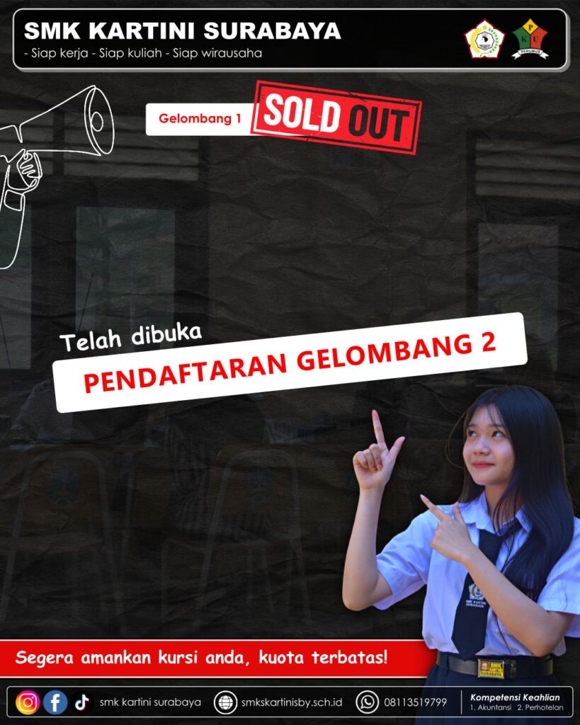 SMK Kartini Surabaya menginformasikan bahwa Pendaftaran Peserta Didik Baru (PPDB/SPMB) Gelombang 1 telah resmi ditutup (sold out) karena kuota telah terpenuhi. Antusiasme masyarakat yang tinggi menunjukkan kepercayaan terhadap kualitas pendidikan dan program keahlian yang dimiliki SMK Kartini Surabaya. Saat ini, pendaftaran Gelombang 2 telah resmi dibuka bagi calon peserta didik baru. Calon siswa diimbau untuk segera melakukan pendaftaran karena kuota terbatas dan akan ditutup apabila daya tampung telah terpenuhi.SMK Kartini Surabaya terus berkomitmen mencetak lulusan yang siap kerja, siap kuliah, dan siap berwirausaha melalui pendidikan vokasi yang berkualitas. Sekolah menyediakan dua kompetensi keahlian unggulan, yaitu Akuntansi dan Perhotelan, yang dirancang sesuai dengan kebutuhan dunia usaha dan industri.Untuk informasi lebih lanjut mengenai pendaftaran Gelombang 2, calon peserta didik dan orang tua dapat mengunjungi website resmi SMK Kartini Surabaya atau menghubungi panitia PPDB melalui nomor 0811 3519 799. Segera amankan kursi Anda dan jadilah bagian dari keluarga besar SMK Kartini Surabaya.