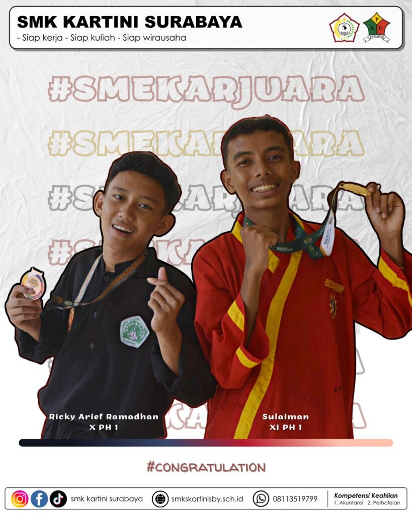 Tak lupa, selamat juga kepada Ricky Arief Ramadhan, siswa kelas X Perhotelan yang berhasil meraih juara 3 dalam Kejuaraan Cabang Pencak Silat Pagar Nusa Kota Surabaya yang diselenggarakan di Atrium IT Maspion Square Surabaya. Dedikasi dan kerja keras yang telah ditunjukkan menjadi contoh inspiratif bagi seluruh siswa SMK Kartini Surabaya untuk terus berprestasi di bidangnya masing-masing.