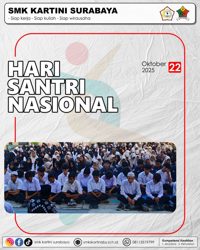 Peringatan Hari Santri Nasional yang jatuh pada 22 Oktober 2025 menjadi momentum penting bagi seluruh santri di Indonesia untuk terus meneguhkan nilai keimanan, akhlak, dan semangat perjuangan. SMK Kartini Surabaya turut memperingati hari bersejarah ini melalui kegiatan keagamaan yang penuh makna dan kebersamaan. Kegiatan ini diikuti oleh seluruh siswa, guru, serta civitas sekolah dengan suasana khidmat dan penuh kekompakan.