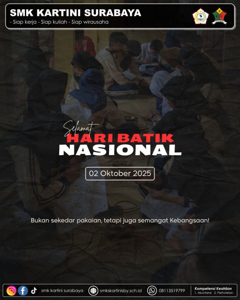Pada tanggal 2 Oktober 2025, SMK Kartini Surabaya turut memperingati Hari Batik Nasional sebagai bentuk penghormatan terhadap warisan budaya Indonesia yang telah diakui dunia. Batik bukan hanya sekadar kain bermotif, melainkan sebuah karya seni yang sarat makna, mencerminkan identitas bangsa, serta menjadi simbol persatuan dan kebanggaan nasional.