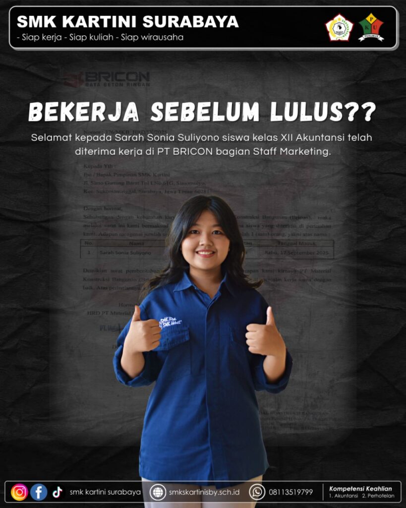 SMK Kartini Surabaya kembali membuktikan kualitasnya sebagai sekolah yang mampu mencetak lulusan siap kerja, siap kuliah, dan siap wirausaha. Salah satu siswi berprestasi, Sarah Sonia Suliyono dari kelas XII Akuntansi, berhasil diterima bekerja di PT BRICON pada bagian Staff Marketing bahkan sebelum resmi lulus. Pencapaian ini tentu menjadi bukti nyata bahwa SMK Kartini Surabaya tidak hanya memberikan teori, tetapi juga pengalaman nyata yang relevan dengan dunia Industri.